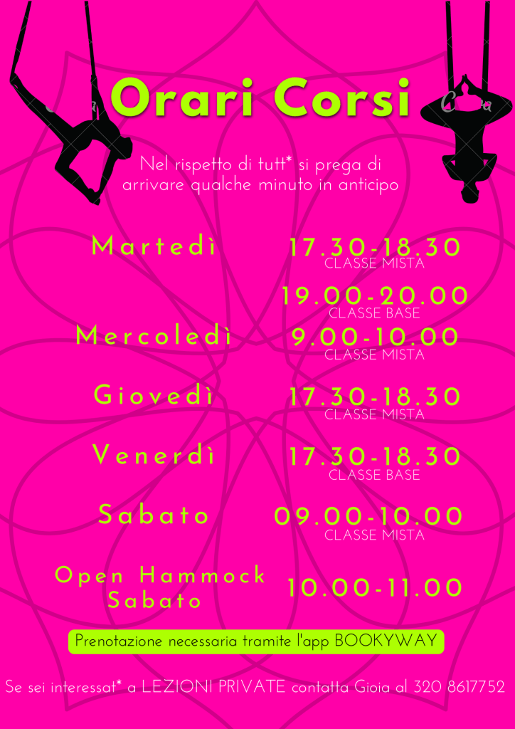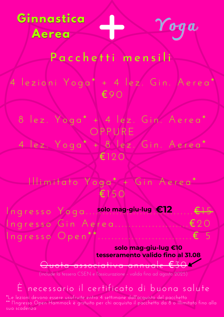 Sono disponibili anche pacchetti per partecipare sia ai corsi di Ginnastica Aerea che di Yoga, trovi qua sotto il prezzario e qua le informazioni sui corsi Yoga estivi.