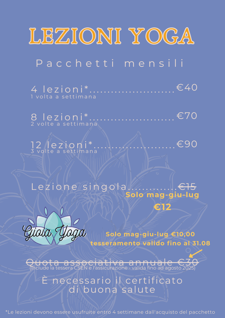 Sono disponibili anche pacchetti per partecipare sia ai corsi Yoga che di Ginnastica Aerea, trovi qua sotto il prezzario e qua le informazioni sui corsi Ginnastica Aerea estivi.